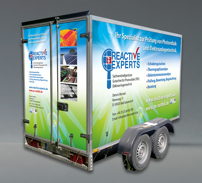 Nach informativen Gesprächen und die Einarbeitung in das Thema, haben wir letztendlich eine optisch ansprechende Gestaltung gefunden, die allen gerecht wird. Außergewöhnlich und trotzdem professionell präsentiert sich REACTIVE EXPERTS nun in der Öffentlichkeit. Dazu tragen die unterschiedlichsten Medien bei, z.B. Fahrzeugbeschriftung, Messestand, Webseite und natürlich die gesamte Geschäftsausstattung mit einem einheitlichen Erscheinungsbild.